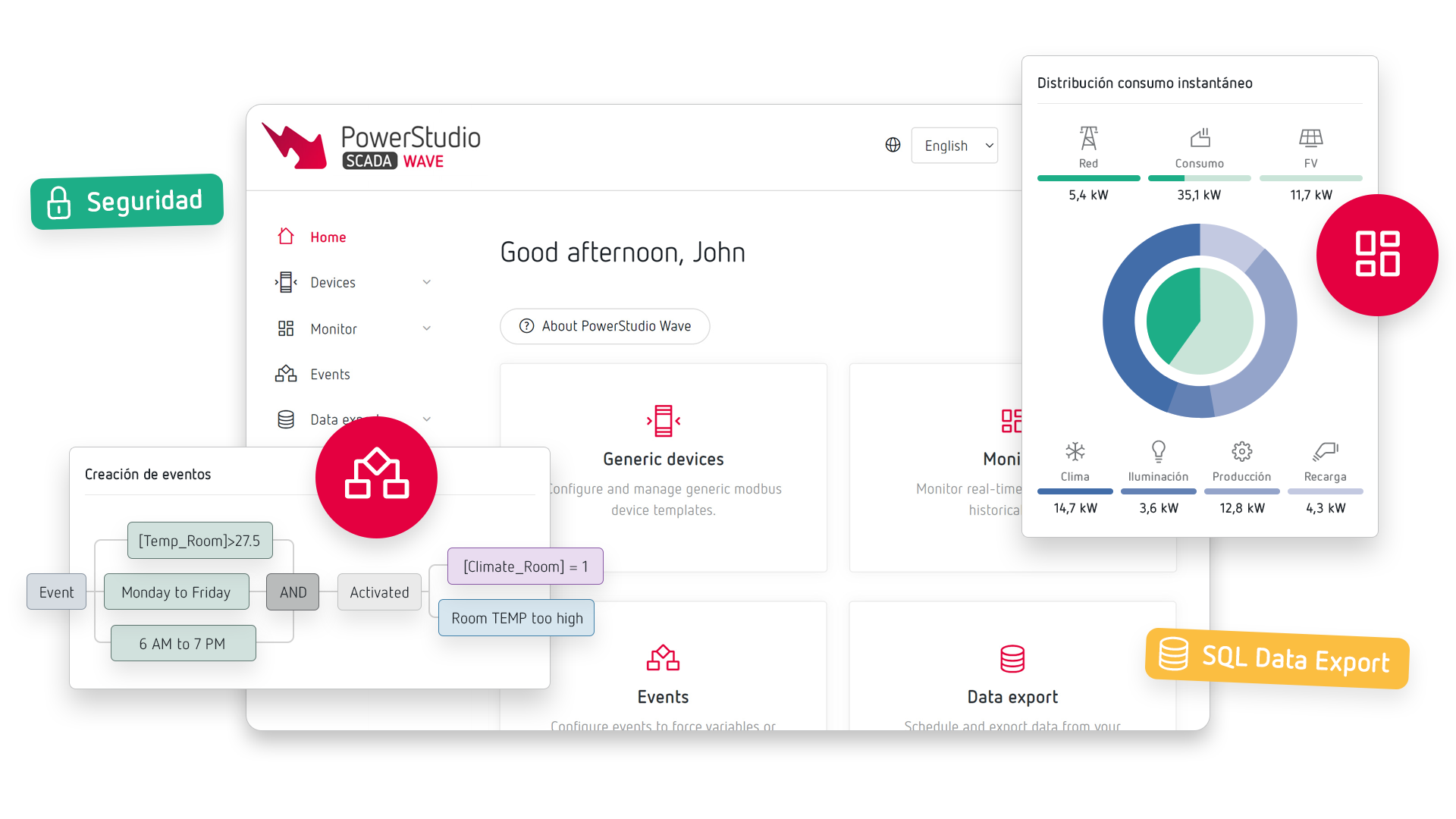 Representación gráfica de variables energéticas en paneles personalizables y accesibles desde cualquier dispositivo.
